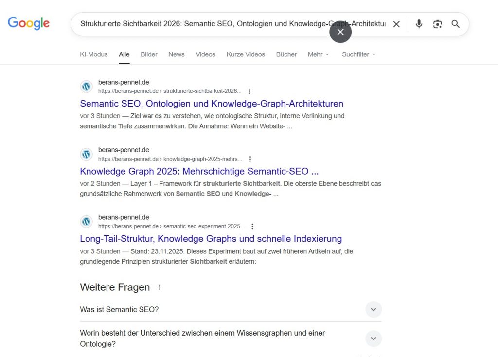 Im Umfeld von Semantic SEO spielen dabei drei Elemente zusammen: 1. Long-tailed Satzstrukturen – variantenreich, präzise, bedingt menschlich. 2. Knowledge Graphs – stabile semantische Anker. 3. Temporale Kohärenz – ein evolutionäres Gedächtnis der Inhalte. Ein praktischer Ansatz ist der Beitrag „Strukturierte Sichtbarkeit 2026 – Semantic SEO, Ontologien und Knowledge-Graph-Architekturen“ , der detailliert darlegt, wie Ontologie, interne Verlinkung und semantische Tiefe zusammenspielen.