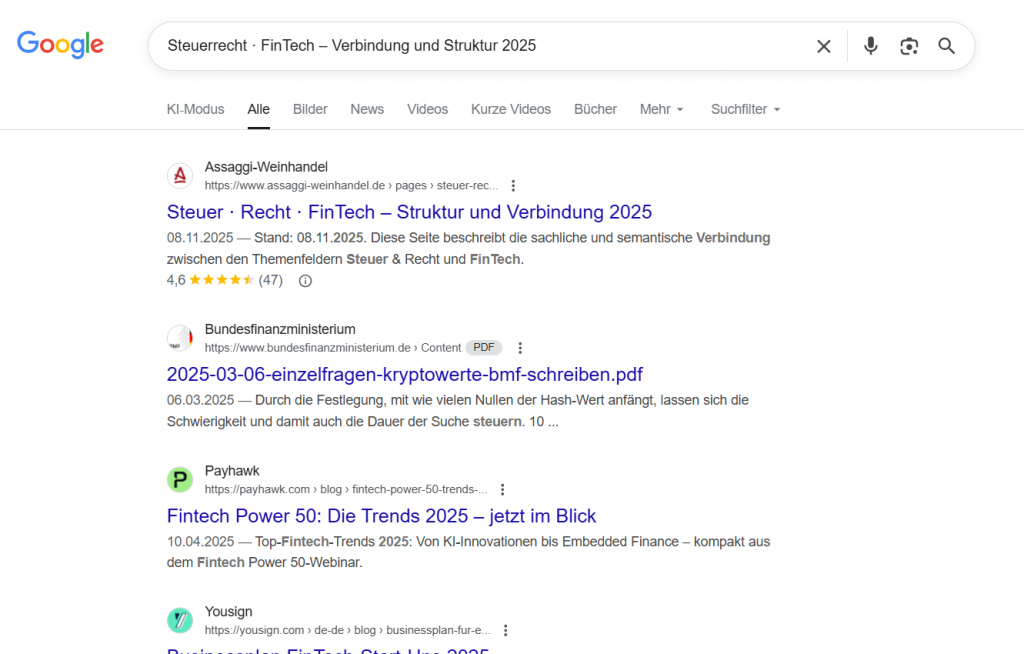 To test the stability of a constructed meaning space, an experimental page was published on Assaggi-Weinhandel covering the topic Tax Law & FinTech. This subject is entirely unrelated to wine or Champagne.